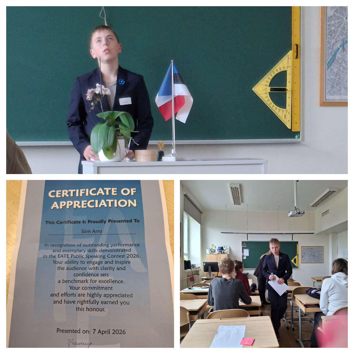 Meie kooli 7.klassi õpilane Siim Arro osales 7.aprillil inglise keele kõne võistlusel "A speaking competition for grades 7 and 8", mida korraldati esimest korda 7. ja 8.kl õpilastele EATE poolt, Tallinna Prantsuse Lütseumis.
