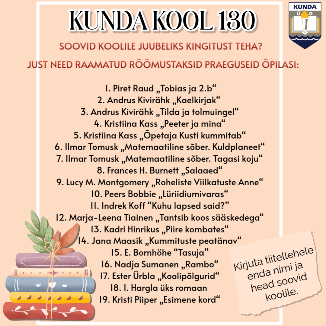 Novembri lõpus tähistame järjekordset aastaringi Kunda hariduselus. 29. novembril toimub selle sündmuse auks pidulik õhtu Kunda koolis. Kui Sinul/sõpruskonnal/klassil on soov sel puhul koolile midagi kinkida, siis on meie palve, et see võiks olla koolile vajalik raamat. Valiku hõlbustamiseks lisame siia rea teoseid, mis septembri alguses on meie raamatupoodides müügil. Hästi tore on, kui raamatu tiitellehele omapoolse hea soovi ja kinkija nime ka sisse kirjutad.